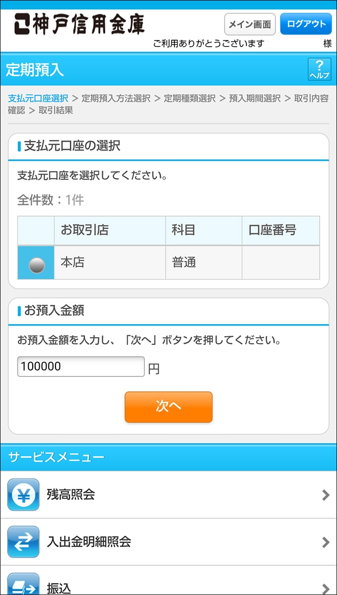 定期預金のご希望金額を、事前に「こうべネット支店」の普通預金口座に入金してください。