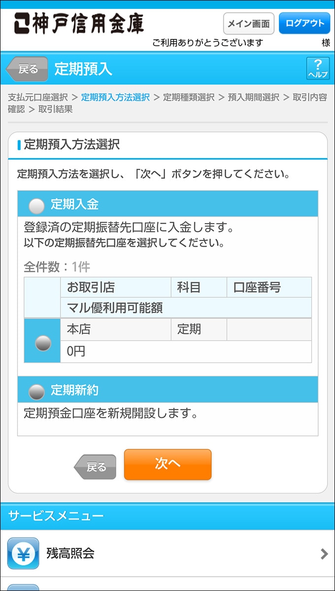 定期預入の方法を選択してください。※「定期新約」新口座で契約する場合※「定期入金」既存定期口座に追加入金する場合
