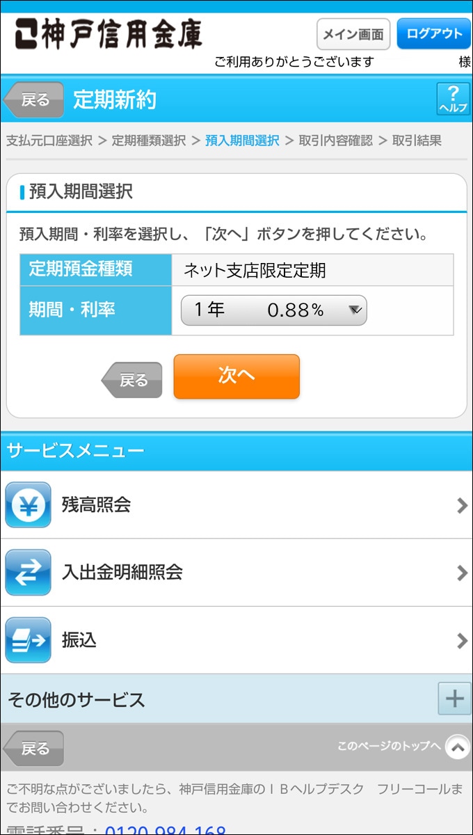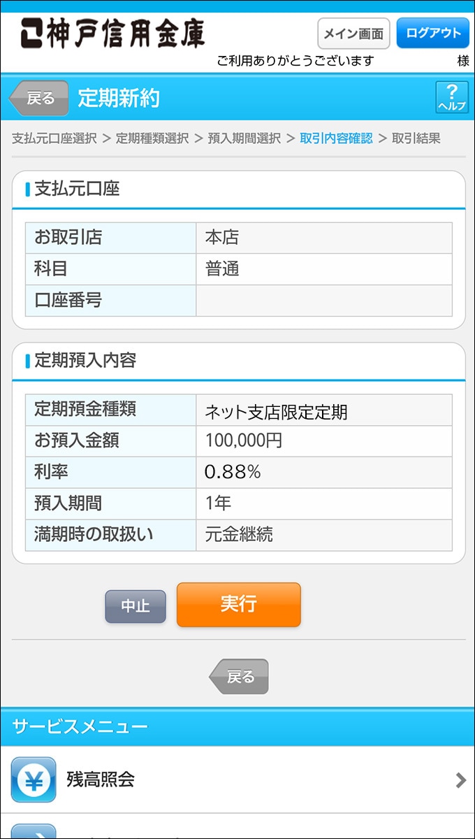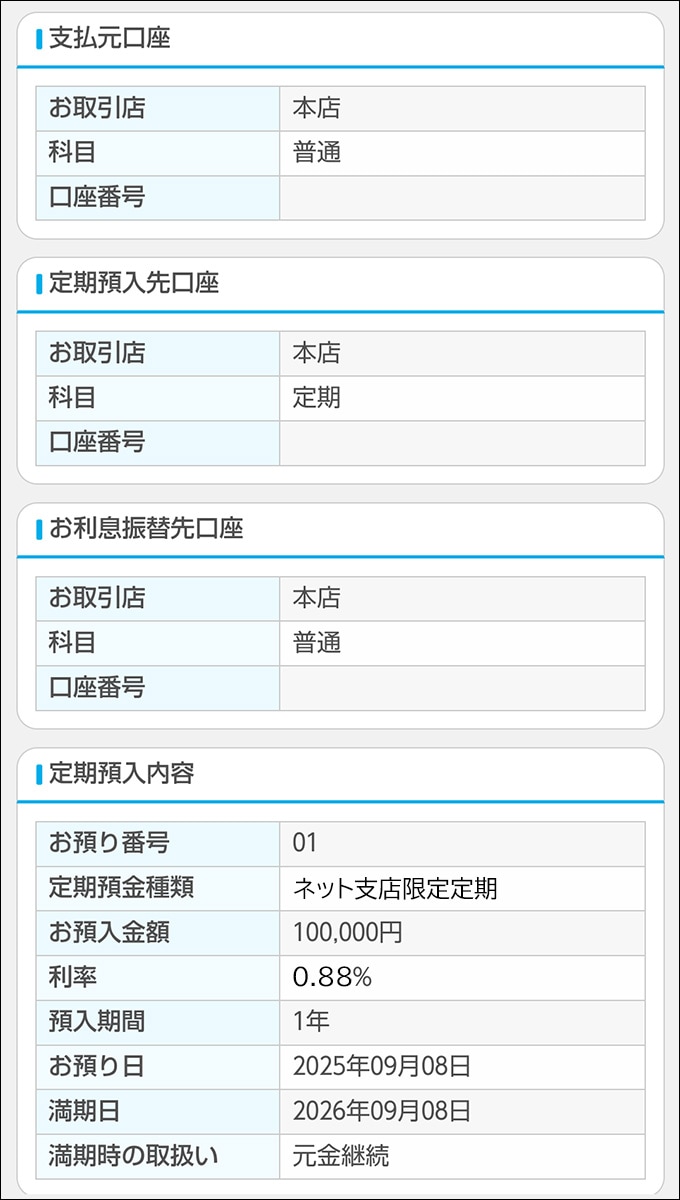 以上で契約手続きは完了です。定期預金の残高はインターネットバンキングでいつでもご確認いただけます。